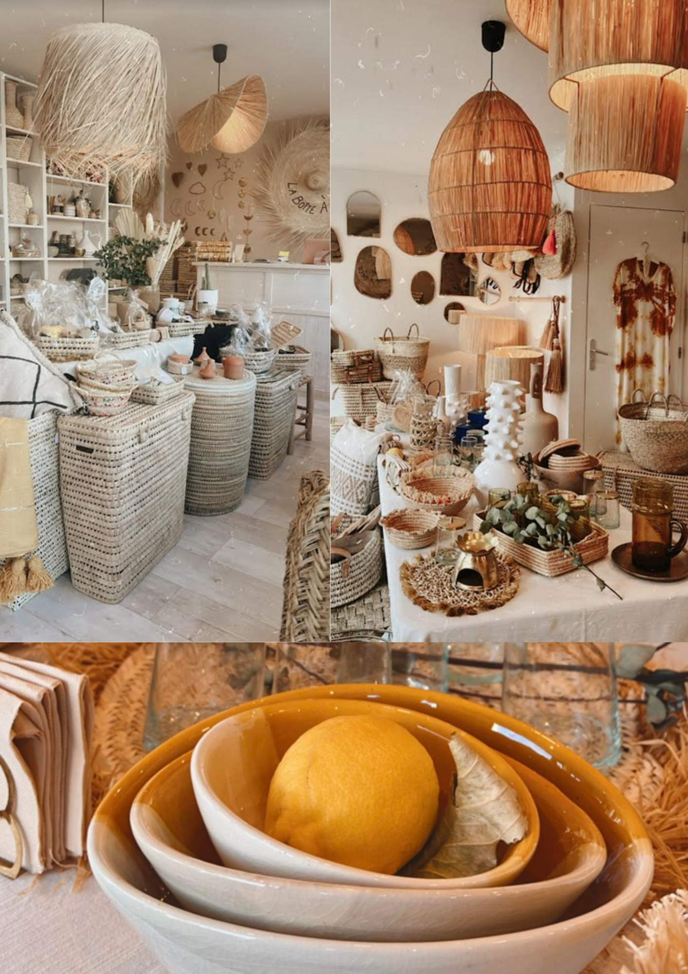 Le Maroc est pour moi depuis toujours une seconde maison. Il était donc logique de proposer leurs produits de qualité mais aussi de vous proposer d’autres articles que l’artisanat ! Feuilles de palmiers, raphia, tadelakt, laiton, cuir … pleins de matières sont présentées en boutique. Vous y trouverez des bancs, des miroirs, de la petite décoration en laiton, de la vaisselle, luminaires, paniers …