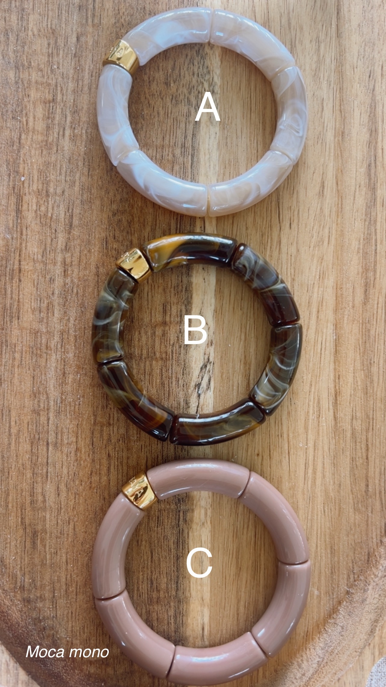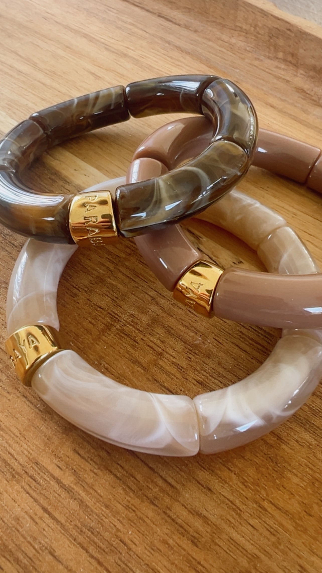 LES BRACELETS SONT COMPOSÉS DE 6 PERLES EN ACRYLIQUE OU RÉSINE DE TRÈS BELLE QUALITÉ ET UNE PERLE GRAVÉE PARABAYA EN ACIER DORÉ À L’OR FIN.